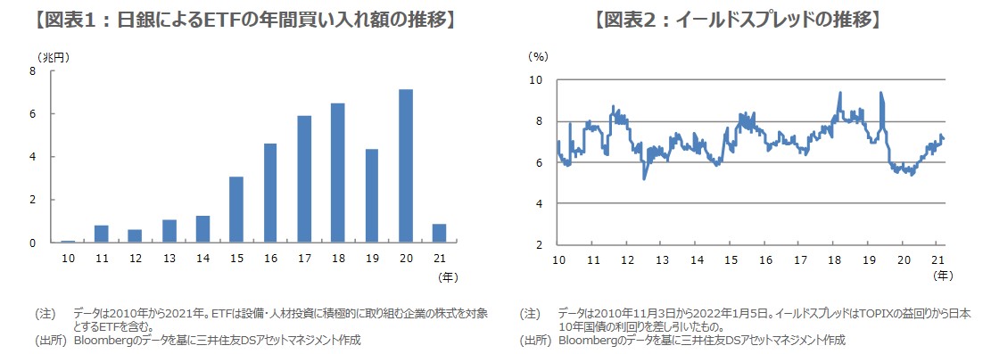 日銀のETF買い入れの目的はリスクプレミアムの縮小を促すことであるため、2021年にETFの年間買い入れ額が大幅に減少したのは、日銀がリスクプレミアム拡大の懸念は小さいと判断したためと思われます。ただ、リスクプレミアムを計測する指標の1つであるイールドスプレッド(株式益回りと国債利回りとの差)は、足元で拡大方向にあり(図表2)、日銀はこの先、必要であれば大規模な買い入れを行うこともあると考えます。