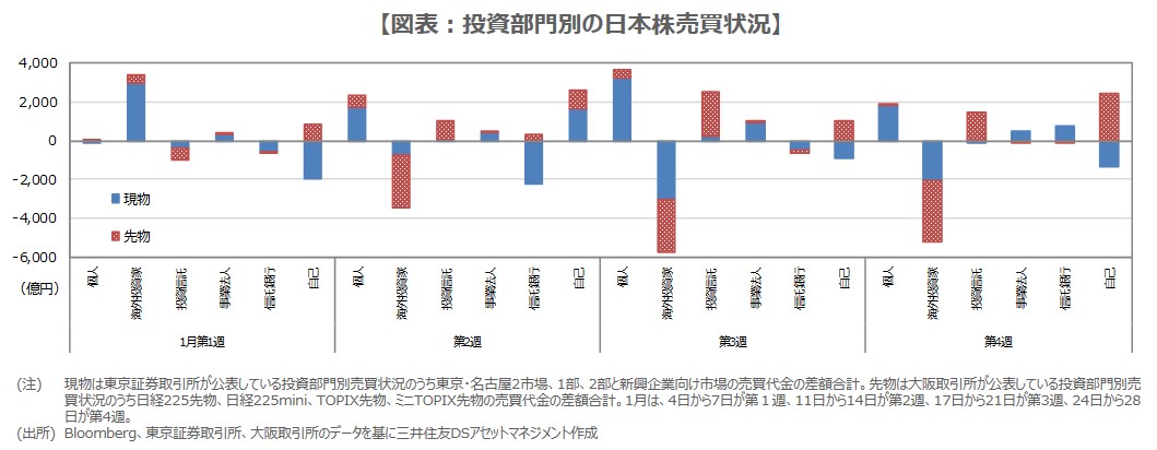 実際の売買状況は図表の通りです。まず、1月第1週において、日経平均株価は週初に29,000円台を回復したものの、その後は失速し、週間で1.1%下落しました。海外投資家はこの週、現物を約3,000億円買い越した一方、自己は現物を約2,000億円売り越しました。そのため、週初の日経平均株価の上昇は海外投資家が主導し、その後の失速は、自己など国内勢の売りに押され、値がさ株中心に崩れたものと推測されます。