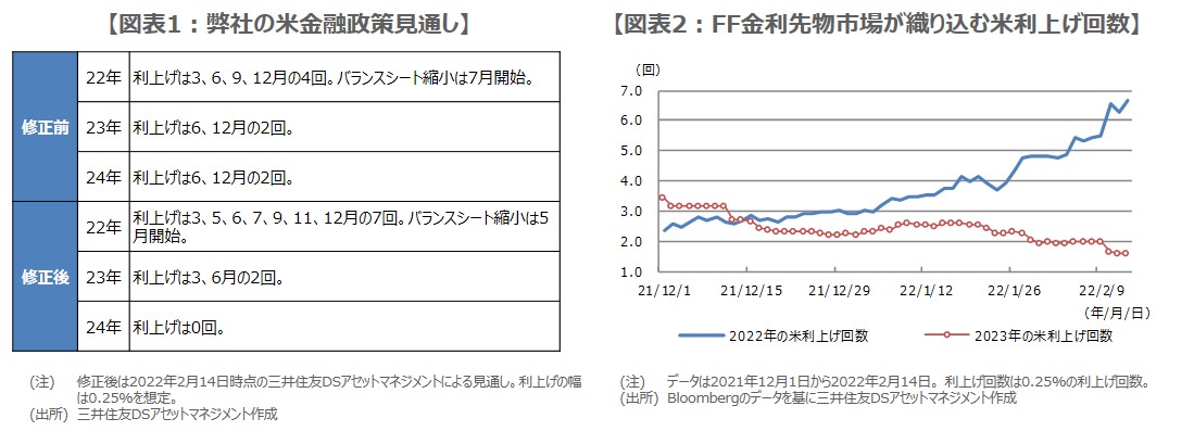 弊社は1月27日時点で、米利上げについて、2022年は3、6、9、12月の4回、2023年は6月と12月の2回、2024年も6月と12月に2回を予想していました(利上げ幅は全て0.25%)。合計8回の利上げにより、フェデラルファンド(FF)金利の誘導目標水準は2.00%~2.25%に達し、米連邦公開市場委員会(FOMC)メンバーが長期均衡水準と考える2.50%に近づきます。なお、バランスシート縮小は2022年7月に開始されるとみていました。