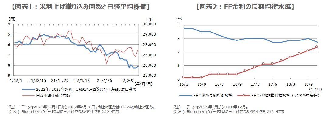 ここまで、米利上げ観測は、日経平均株価の方向性に大きな影響を与えてきた要因の1つと考えられます。実際、フェデラルファンド(FF)金利先物市場が織り込む利上げ回数と、日経平均株価の推移を重ねてみると、利上げの織り込みが進むにつれて、おおむね株価水準は切り下がっており(図表1)、日経平均株価が利上げペースの加速を強く警戒している様子がうかがえます。