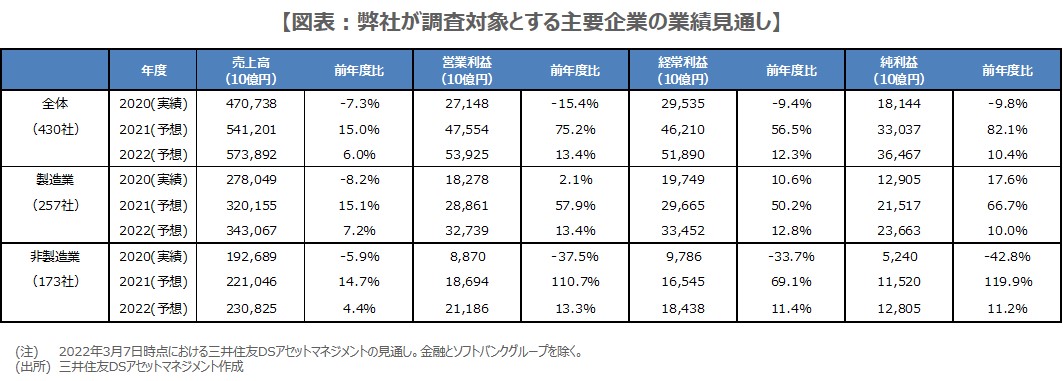 はじめに、前年度、すなわち2021年度の着地見通しを確認します。2021年度の売上高は541.2兆円、営業利益は47.6兆円、経常利益は46.2兆円、純利益は33.0兆円を見込んでおり、前年度比の伸び率は、順に+15.0%、+75.2%、+56.5%、+82.1%の予想です(図表)。大幅な増収増益で着地するとの見方ですが、これはコロナの影響で業績が低迷した前年度の反動によるところが大きいと考えます。