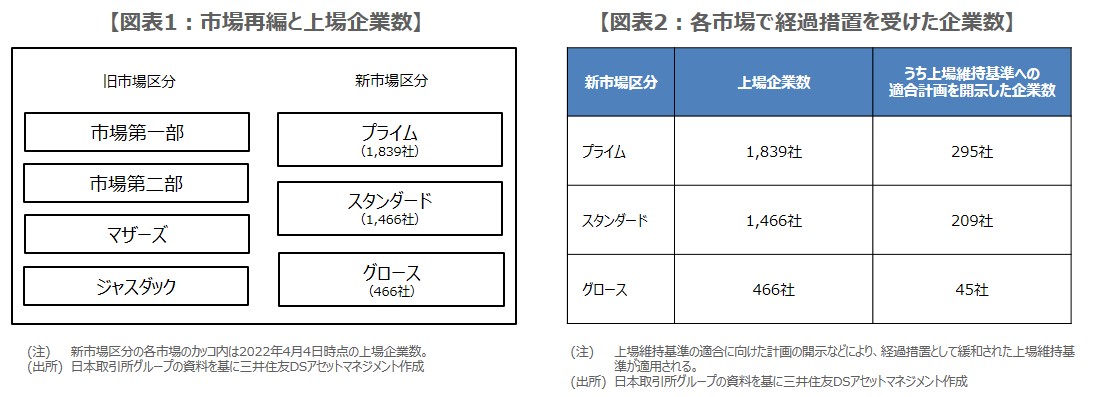 東京証券取引所(以下、東証)は4月4日、「市場第一部」、「市場第二部」、「マザーズ」、「ジャスダック」の4市場を再編し、新たに「プライム」、「スタンダード」、「グロース」の3市場を発足させました(図表1)。東証が本格的に市場の再編に着手したのは、市場第二部を新設した1961年以来約60年ぶりとなり、今回、新市場への新規上場および上場維持には、厳格な審査基準が設けられました。