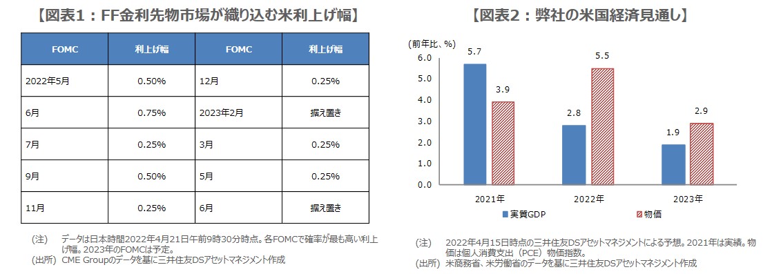 また、米連邦準備制度理事会(FRB)のウォラー理事は4月13日、5月の米連邦公開市場委員会(FOMC)で0.50%の利上げ支持を改めて表明し、6月と7月も0.50%の利上げはありうるとの見解を示しました。このような状況下、直近のフェデラルファンド(FF)金利先物市場では、5月のFOMCで0.50%、6月に0.75%の利上げが見込まれています(図表1)。