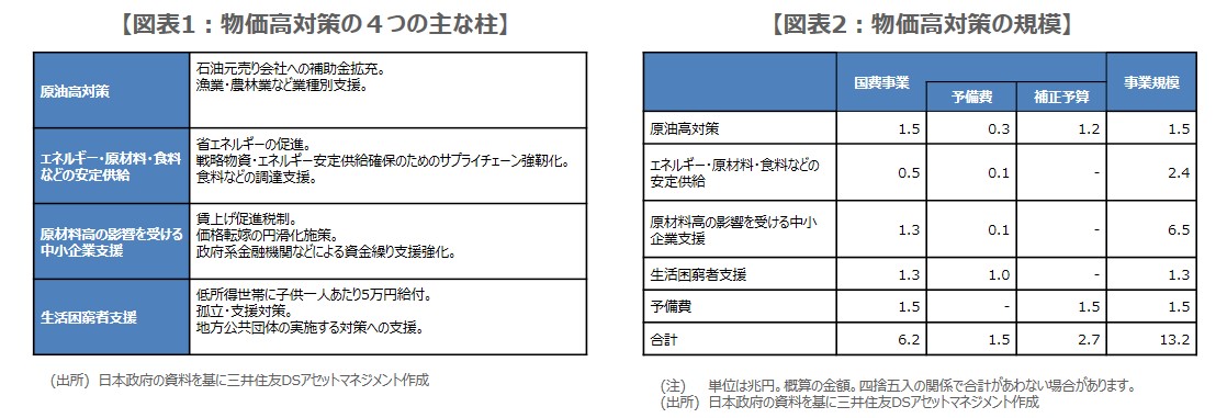 具体策として、①には、石油元売り会社への補助金拡充、漁業・農林業など業種別の支援、②には、省エネルギーの促進、原材料・食料の調達支援、などの施策が盛り込まれました(図表1)。また、③には、中小企業に対する賃上げ促進税制や、政府系金融機関による資金繰り支援強化などが明記され、④では、低所得世帯に子供一人あたり5万円が給付されることになります。