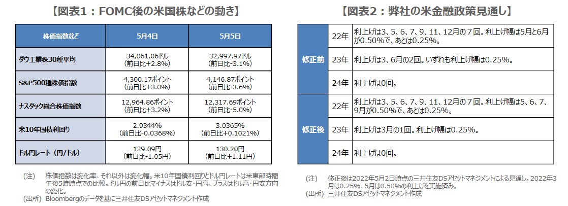 パウエル議長が0.75%の利上げ実施に慎重な考えを示したことから、5月4日の米国市場は、株価上昇、長期金利低下、ドル円はドル安・円高で反応しました(図表1)。しかしながら、翌5日にはこれらの動きが一気に反転しており、この点を踏まえると、「FRBが景気を大きく減速させることなく、インフレ抑制に成功する」という期待は、まだ市場でしっかりと形成されていないように見受けられます。