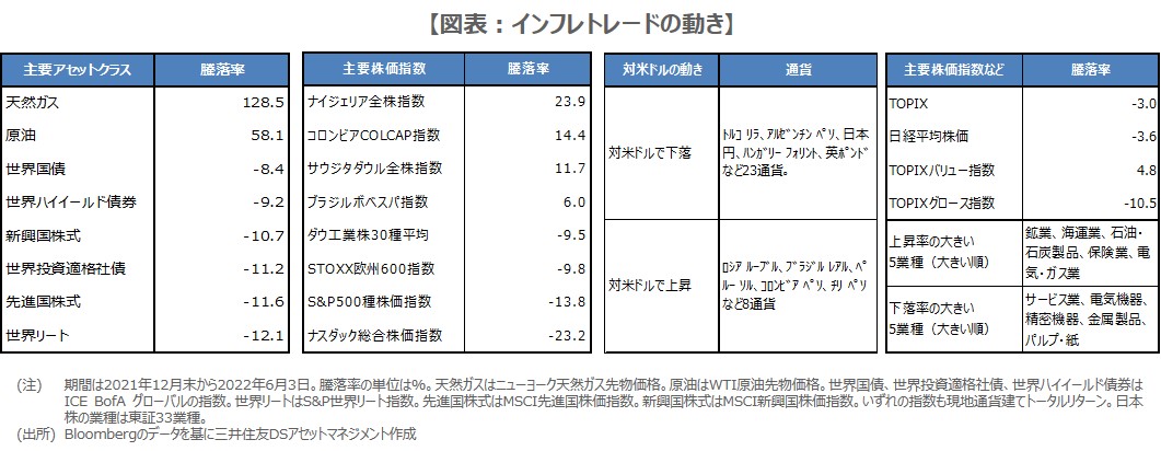 インフレトレードとは一般に、物価上昇を見込んで、投資対象を選定する取引のことです。通常、株式や商品など、物価上昇に強いとされる資産が選好される一方、利上げによる金利上昇の影響を受けやすい債券は、敬遠される傾向があります。実際、年初からの主要アセットクラスの推移をみると、原油高や債券安の動きが確認されます(図表)。ただ、株式については、欧米株の下げが顕著です。