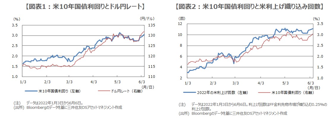 市場では、すでに135円水準が意識されつつありますが、ドル円レートの方向性のカギを握るのは、引き続き米10年国債利回りと考えます。なお、同利回りは、フェデラルファンド(FF)金利先物市場が織り込む2022年の米利上げ回数と高い連動性がみられます(図表2)。現状、6月、7月、9月に0.50%、11月と12月は0.25%の利上げが想定されていますが、これ以上の利上げ織り込みは、なかなか想定が難しいように思われます。