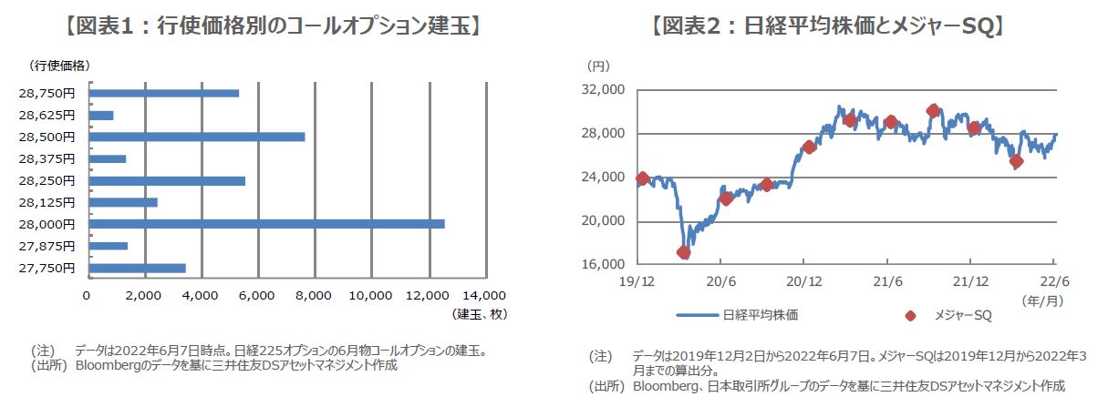 では実際に、日経225オプションの取引動向を確認してみます。6月物コールオプションは、28,000円の行使価格で、建玉(たてぎょく、未決済残高のこと)が相対的に大きく積み上がっていることが分かります(図表1)。そのため、例えばSQの前々日(本日)や、前日(明日)あたりで、日経平均株価が28,000円を超えていると、日経平均株価の上昇ペースが加速する展開も想定されます。