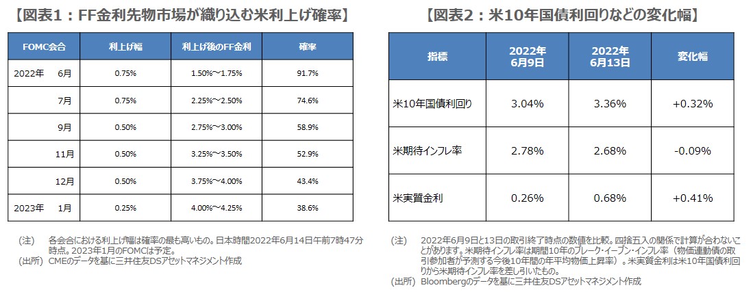 フェデラルファンド(FF)金利先物市場では、米利上げの織り込み度合いが急速に強まっています。これは、先週末に発表された5月の米消費者物価指数(CPI)が市場予想を上回る伸びとなり、更なる大幅利上げが必要との見方が広がったためと考えられます。日本時間の本日朝方時点で、6月14日、15日開催の米連邦公開市場委員会(FOMC)における0.75%の利上げは、FF金利先物市場にほぼ織り込み済みとなっています(図表1)。