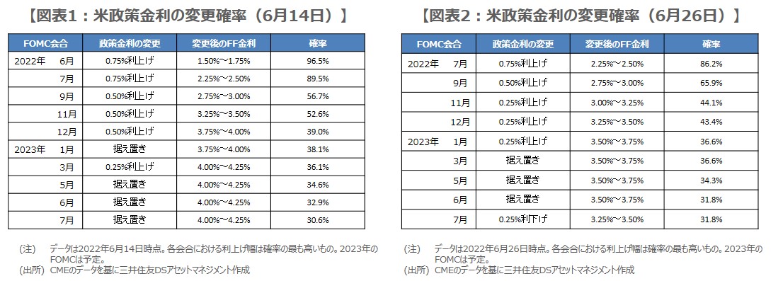 米主要株価指数の下落と米10年国債利回りの上昇の背景にある、大幅な連続利上げ見通しは、フェデラルファンド(FF)金利先物市場で確認することができます。実際に、6月14日時点の動きをみると、FF金利の誘導目標は2023年3月に4.00%~4.25%に達するとの見方が示されています(図表1)。しかしながら、このように短期間で大幅な利上げが織り込まれたことで、これ以降、市場にいくつか変調がみられるようになりました。