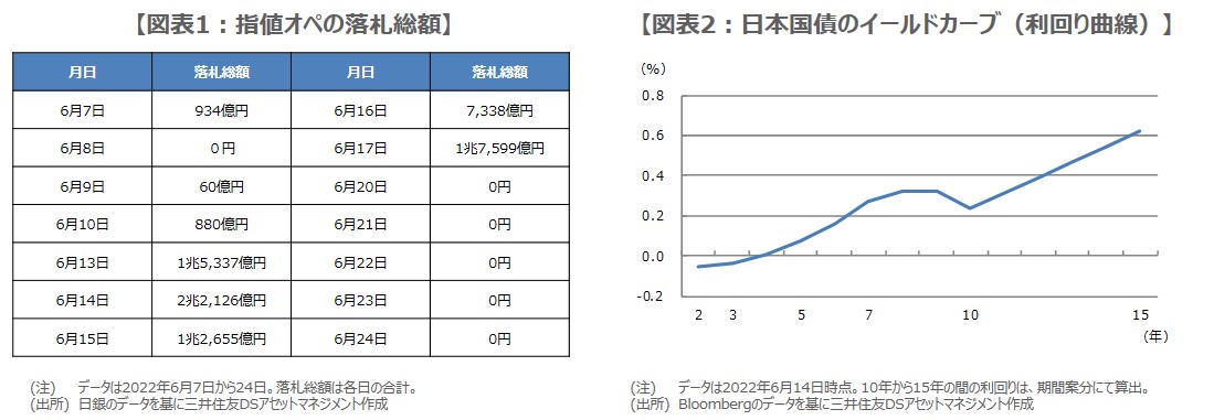 実は日銀は、今回の会合前に、すでに長期金利の上昇を抑え込む姿勢を鮮明にしていました。6月に入ると、米長期金利の上昇を主因に、国内でも10年国債利回りが上昇し、「長短金利操作(イールドカーブ・コントロール)」の上限である0.25%程度を上回るようになりました。これに対し日銀は、毎営業日実施している10年国債を0.25%で無制限に買い入れる「指し値オペ」や(図表1)、国債買い入れの大幅増額で、利回り上昇の抑制に努めました。