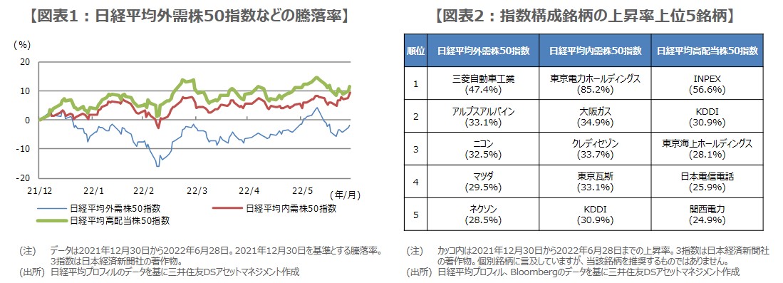 参考までに、各指数を構成する銘柄のうち、昨年末から昨日までの期間において、上昇率の大きい上位5銘柄は図表2の通りです。今回は、日経平均外需株50指数、日経平均内需株50指数、日経平均高配当株50指数の動きを検証しましたが、年初来のパフォーマンスは、3指数とも日経平均株価とTOPIXを上回っており、日経平均内需株50指数と日経平均高配当株50指数はプラス圏にあります。