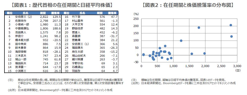 ただ、分析のデータが30と少なく、また、ここでは詳細な分析を省略しているため、分析結果は1つの目安とした方が良いと考えます。それでも、首相の在任期間が長いということは、政権安定の証左であり、これは日本株に投資する海外投資家に好感されやすい材料です。また、経済や金融市場が負のショックに直面した場合、迅速な政策対応が可能になる点で、株式市場にも好ましいといえます。