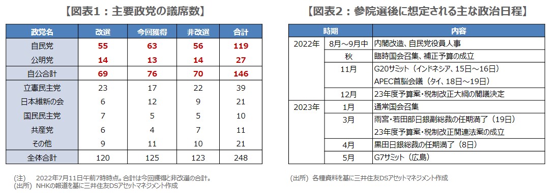 投開票の結果(7月11日午前7時時点)、自由民主党(以下、自民党)が63議席(選挙区45議席、比例代表18議席)と、単独で改選定数の過半数を獲得し、大勝しました(図表1)。また、公明党とあわせた与党の獲得議席は、改選69議席を上回る76議席となり、岸田文雄首相(自民党総裁)が勝敗ラインとして掲げた「非改選を含めて与党で過半数」(非改選70議席のため改選55議席で過半数)を大幅に超えました。