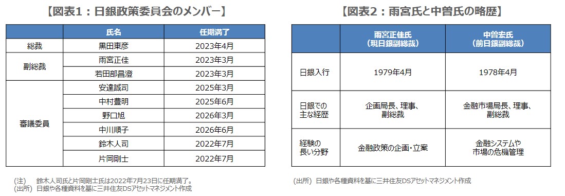 次期総裁候補として、市場でよく名前が挙がるのは、雨宮氏と前副総裁の中曽宏大和総研理事長です(図表2)。雨宮氏は、金融政策の企画・立案を行う企画畑が長く、異次元緩和などの金融政策の設計にかかわってきました。中曽氏は、金融システムや市場の危機管理の経験が長く、国際決済銀行(BIS)市場委員会で議長を務めたこともあり、国際派として知られています。
