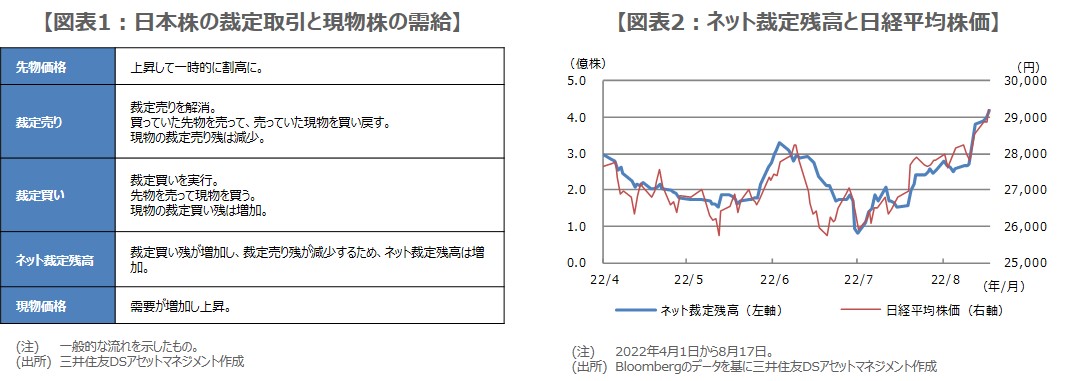 なお、ネット裁定残高は、8月10日に2億7,292万株でしたが、8月17日には4億2,068万株に急増していることから、やはり、この期間の需給の改善が、日経平均株価の上昇につながったと考えられます。なお、現物価格の上昇などにより、先物価格とのかい離が消滅すれば、裁定買い取引は解消されるため、今度は、裁定買い残減→ネット裁定残高減→現物需要減という流れになりやすく、注意が必要です。