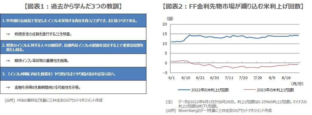 一方、9月の政策判断は、今後のデータや経済見通し次第であり、金融政策のスタンスがさらに引き締まるにつれて、ある時点で、利上げペースを緩めることが適切となる可能性があるとし、こちらも従来の見解を繰り返しました。そして最後に、インフレに関して過去から3つの教訓(図表1)を学び、それらを基に、インフレ率を引き下げる仕事が完了したと確信できるまで、強力かつ迅速な手段を講じると述べ、講演を終えました。
