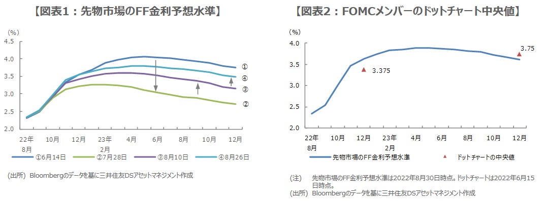 改めて、FOMCメンバーが適切と考えるFF金利水準の分布(ドットチャート)をみると、中央値で2022年末が3.375%、2023年末が3.75%で、2023年は利上げ継続という見方です(図表2)。最近のFOMCメンバーの発言を踏まえると、9月のFOMCでは、分布が上方修正されることも想定されます。実際にそうなった場合、FF金利先物市場の反応、とりわけ2023年の利下げ予想が消滅するか否かが注目されます。