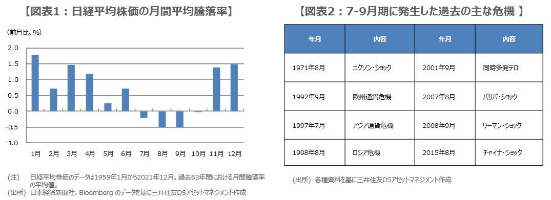日経平均株価のこのような傾向は、過去、7-9月期に大きな危機やショックがよく発生したことが影響していると推測されます(図表2)。株式市場では、引き続き米国の物価動向、利上げペース、景気への影響が主な焦点となっており、今晩発表の8月米雇用統計、9月13日の米8月消費者物価指数、20日、21日の米連邦公開市場委員会(FOMC)が注目されるなか、今年もかなりボラタイルな(変動の大きい)9月相場が予想されます。