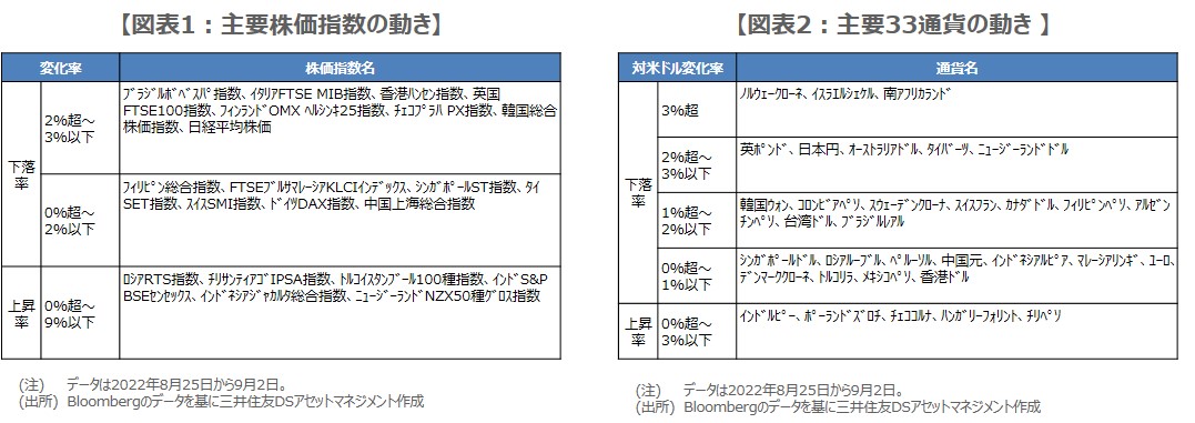 経済シンポジウム「ジャクソンホール会議」において、パウエル米連邦準備制度理事会(FRB)議長がインフレ抑制に強い姿勢を示してから、約1週間が経過しました。今回のレポートでは、8月26日のパウエル議長の講演前日から、先週末9月2日までの期間について、主要市場がパウエル議長のタカ派的な発言を受け、どのような反応を示したか、改めて確認します。