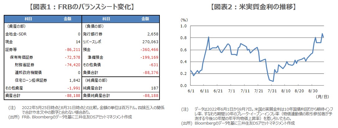 保有資産の縮小上限額は、今月から月950億ドル(財務省証券が月600億ドル、政府機関債とMBSが月350億ドル)に倍増します。大幅な利上げ継続が見込まれるなか、QTによる量の引き締め効果が倍増することになるため、足元では米実質金利に上昇圧力が生じている様子がうかがえます(図表2)。株価には目先、やや厳しい環境となりますが、インフレ抑制につながれば、長期的には好ましい状況に向かうと思われます。