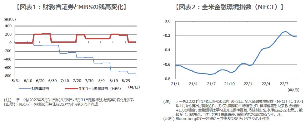米国の金融環境は、大幅利上げやQT開始を受け、緩和の度合いは修正されつつありますが、まだそれほど引き締まった状態ではありません(図表2)。ただ、QTに関し、今月から保有資産の縮小上限額が月950億ドル(財務省証券が月600億ドル、政府機関債とMBSが月350億ドル)に倍増するため、もう一段の金融環境の引き締まりが予想されます。これによる早期インフレ抑制の成否が、株価安定のカギを握ることになると思われます。