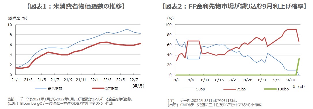 フェデラルファンド(FF)金利先物市場では、9月に75ベーシスポイント(bp、1bp=0.01%)の利上げが行われる確率が67%、100bpが33%となり、一段の大幅利上げの織り込みが進みました(図表2)。また、米国債利回りの前日比の上昇幅は、10年債が約5bp、2年債は約18bpとなり、為替は米ドルがほぼ全面高のなか、ドル円は前日から約1円74銭ドル高・円安が進行しました(いずれもニューヨーク市場終了時点での比較)。