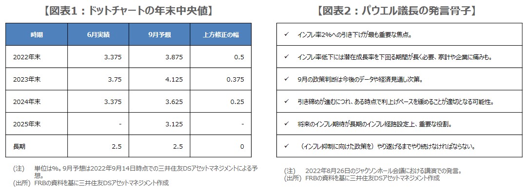 弊社は新たなドットチャートの中央値について、2022年末が3.875%、2023年末は4.125%、2024年末は3.625%を予想しており、6月からの上方修正の幅は、順に50bp、37.5bp、25bpとなります(図表1)。また、今回新たに示される2025年末は3.125%、Longer runは変わらず2.5%を想定しています。つまり、ドットチャートでは2023年も利上げ継続、2024年と2025年は緩和期待が強まらない程度の小幅な利下げが示されると考えています。