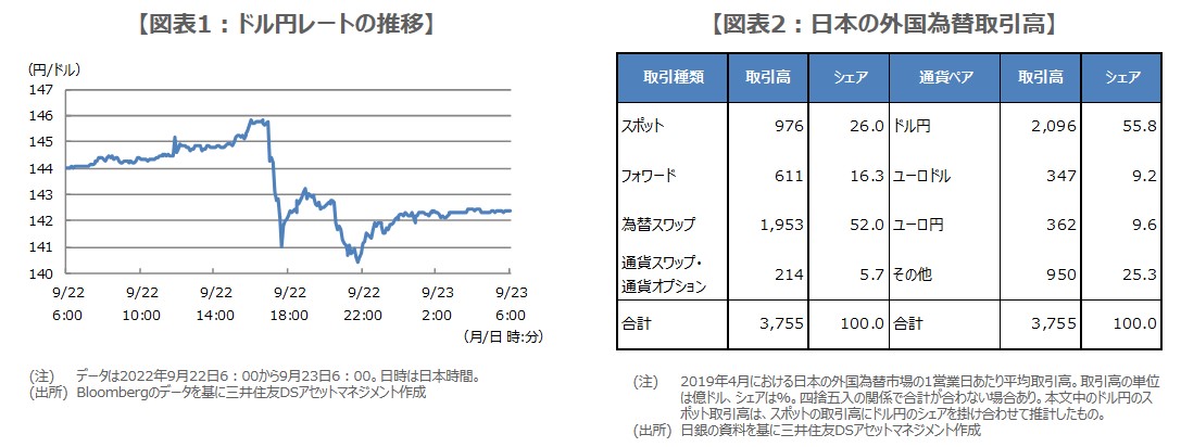 政府・日銀は9月22日、1998年6月以来、約24年ぶりとなるドル売り・円買いの為替介入に踏み切りました。この日は午後3時半から日銀の黒田東彦総裁の記者会見が行われましたが、金融緩和維持の強い姿勢が確認されたことで、ドル円は午後4時頃に1ドル=145円90銭近くまでドル高・円安が進行しました(図表1)。為替介入はこれを受け、午後5時頃に実施された模様で、その後は140円35銭付近までドル安・円高が進みました。