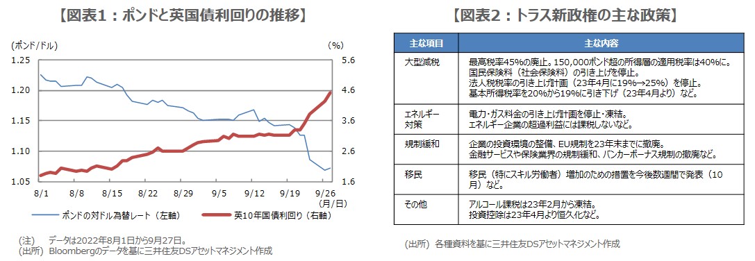 先週来、英国の通貨ポンドが急落し、対主要通貨でほぼ全面安の展開となっています。9月26日には、対ドルで1ポンド=1.0350ドル水準まで下落し、1972年の変動相場制移行後の最安値をつけました(図表1)。こうしたなか、債券市場では英国債の利回りが急騰(価格は急落)しており、9月27日には10年国債利回りが一時4.53%台まで上昇したほか、30年国債利回りも一時5%台に乗せ、2002年以来の高水準に達しました。