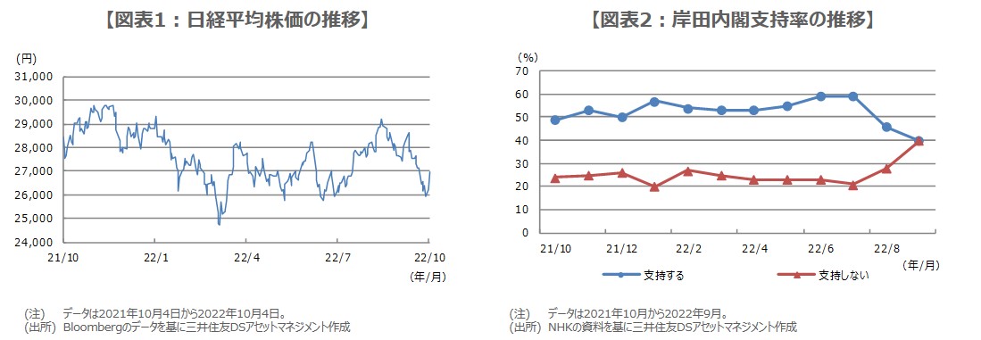 このように、岸田政権はこの1年間で、2つの選挙で基盤を固め、2つの経済対策を打ち出しました。ただ、新しい資本主義の実現にはまだ道半ばで、日本経済の潜在成長率を高める効果的な政策の実施が待たれます。日経平均株価はこの1年、外部環境の影響を大きく受けたため、岸田政権に対する評価は判断しにくい状況です。ただ、最近の内閣支持率低下は気掛かりで(図表2)、今後、相場の材料となることも想定され、引き続き要注目です。