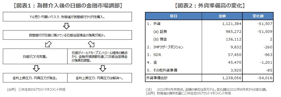 一般に、ドル売り・円買い介入は、財務省が民間銀行から円を買うため、民間銀行が日銀に預けている日銀当座預金の残高減少要因となり、日銀がこれを放置すれば、当然ながら金利上昇要因、円高要因となります。しかしながら、日銀がイールドカーブコントロールを維持すべく、金融市場調節を通じて日銀当座預金の残高を調整すれば、金利上昇圧力や円高圧力は解消されるため(図表1)、円買い介入→金利上昇→円高という流れにはなりません。