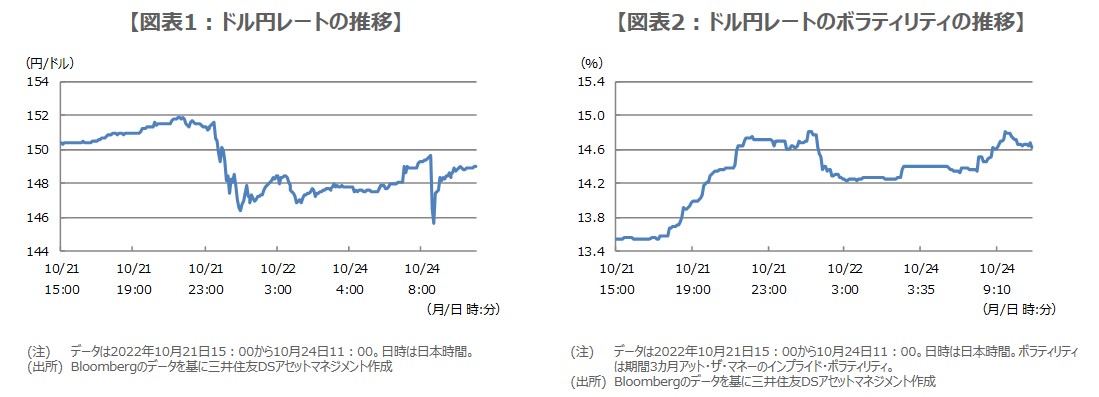なお、神田真人財務官は10月22日の日本時間未明、記者団に対して「介入の有無についてはコメントしかねる」と述べ、9月22日の為替介入と異なり、今回は実施を明らかにしませんでした。ただ、10月21日のドル円は、151円を超え、152円の突破も試す勢いがみられたことや、当局が注目するボラティリティ(変動率)も上昇していたことから(図表2)、恐らく為替介入が実施されたものと考えます。