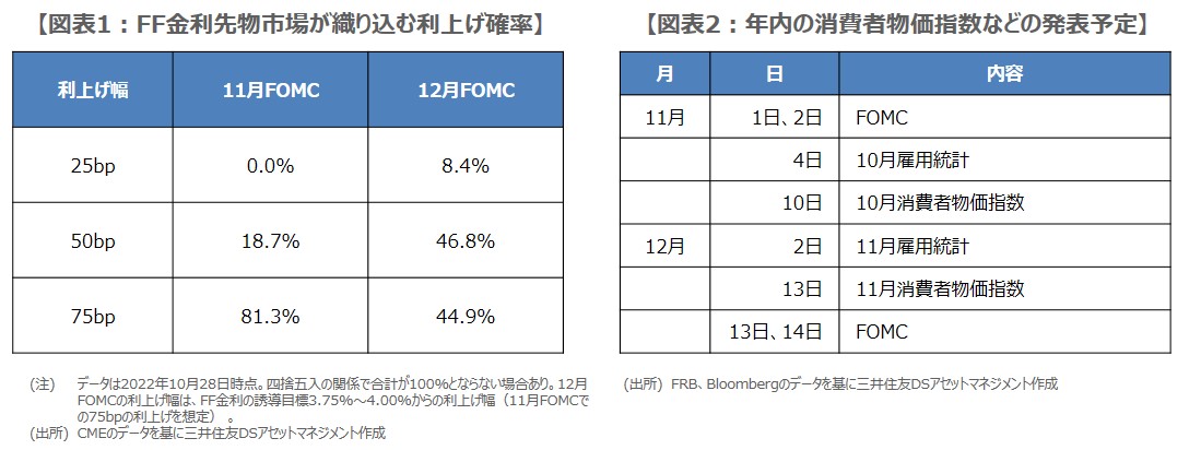 米連邦準備制度理事会(FRB)は、11月1日、2日に米連邦公開市場委員会(FOMC)を開催します。弊社は今回、75ベーシスポイント(bp、1bp=0.01%)の追加利上げが行われると予想していますが、フェデラルファンド(FF)金利先物市場でも、75bpの利上げ確率は10月28日時点で81.3%となっており(図表1)、4会合連続で75bpの利上げが決定されることは、ほぼ織り込み済みです。