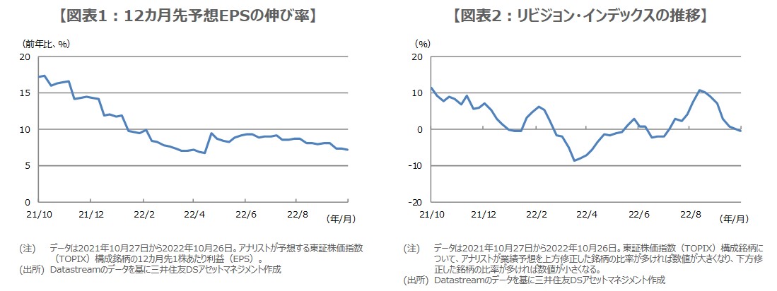また、市場が予想するTOPIXの12カ月先1株あたり利益(EPS)の伸び率は低下傾向にあり(図表1)、リビジョン・インデックスも直近でマイナスになるなど(図表2)、2023年度の業績に対する、市場の慎重な見方がうかがえます。この先、これらが好転し、日本株が上昇基調を強めるには、企業を取り巻く環境の改善、すなわち、欧米などでのインフレの鎮静化、利上げペースの鈍化、景気後退懸念の払しょく、といった材料が必要と思われます。