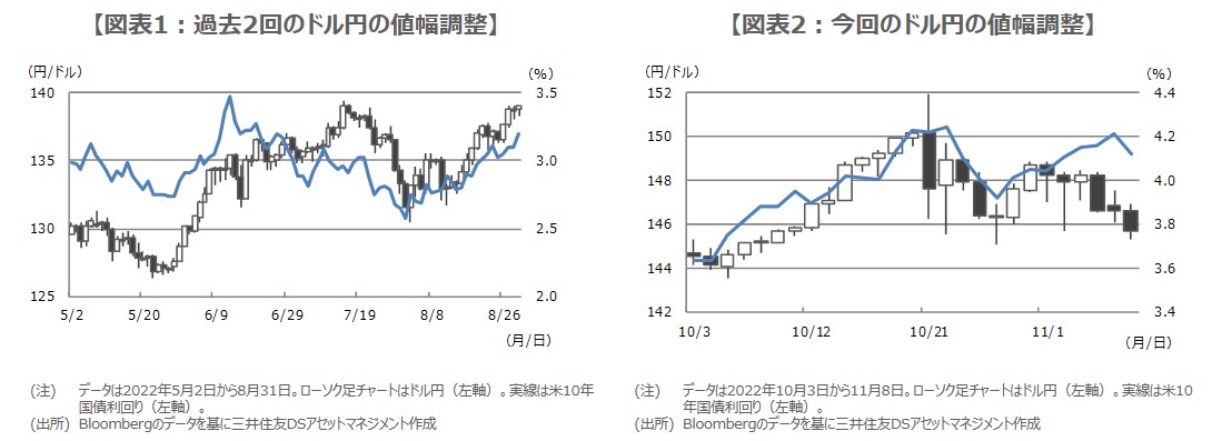今回、10月21日から11月8日までの期間で考えた場合、12営業日で6円64銭ほどドル安・円高に振れたことになります(図表2)。過去2回の傾向を踏まえると、ドル円の値幅調整は、まずまず進んだと考えられます。また、前述の通り、米長期金利は、10月下旬にみられた低下の動きは一時的なものにとどまっており、ドル円の底堅さは一定程度、保たれると思われます。