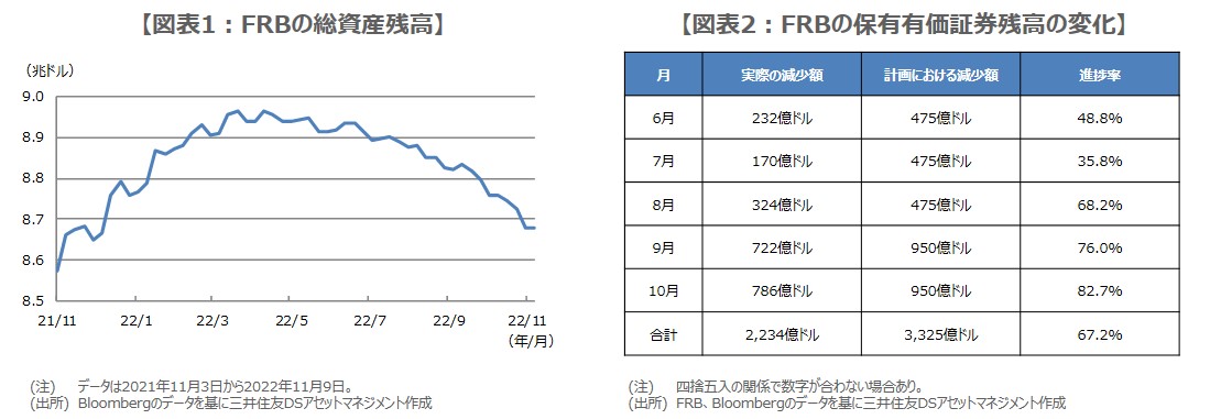 米連邦準備制度理事会(FRB)は、国債などの保有資産を減らす、いわゆる量的引き締め(QT)を2022年6月1日から開始しました(図表1)。計画によると、縮小の上限額は、財務省証券と政府機関債、住宅ローン担保証券(MBS)の合計で、当初は月475億ドル、3カ月後には一気に倍増し、月950億ドルとなります。今回のレポートでは、QTが開始されてから5カ月経過後の進捗状況を検証します。
