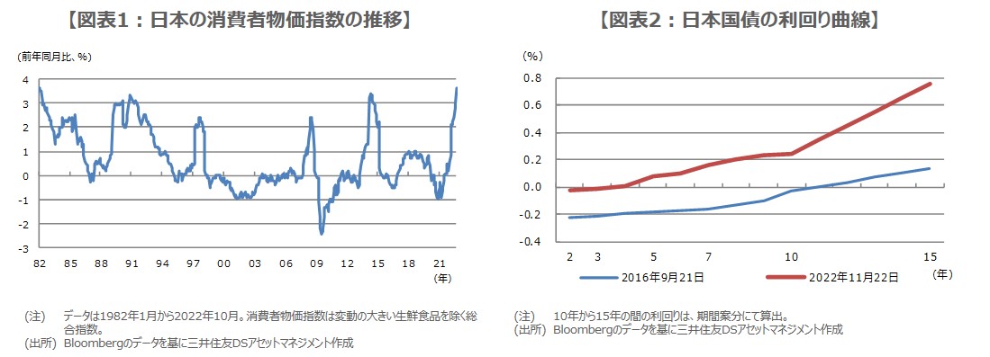 現行の長短金利操作付き量的・質的金融緩和は、2016年9月に導入が決定され、6年以上が経過しています。日本国債の利回り曲線(イールドカーブ)の変化は図表2の通りで、上方シフトの動きが鮮明です。なお、YCCにおける10年国債利回りの操作目標はゼロ%程度ですが、上下0.25%の変動が許容されており、2022年11月22日時点の10年国債利回りは0.24%台と、上限付近に達しています。