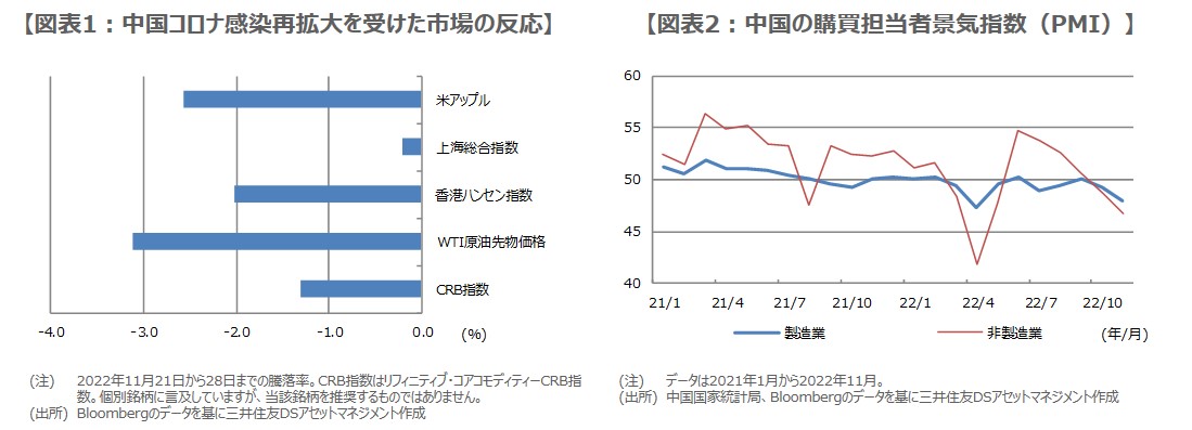 中国でロックダウンが強化されれば、中国進出企業が工場の操業を停止するなどの思惑から、中国関連株の下落につながりやすく、また、中国経済の成長ペースが鈍化するとの見方が強まれば、中国株の下落や、原油などの商品価格の下落につながりやすいと考えられます。実際、コロナの感染が再拡大し、抗議活動が広がるまでの期間、市場の動きをみると、おおむね想定された反応が確認されます(図表1)。