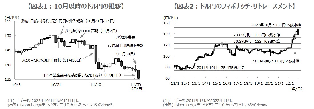 10月以降のドル円の推移をみると(図表1)、10月下旬に政府・日銀によるドル売り・円買い介入観測が浮上し、ドル高・円安の動きが一服すると、11月の米連邦公開市場委員会(FOMC)でのハト派的な声明を受け、緩やかにドル安・円高が進行しました。その後、米10月消費者物価指数が予想比下振れとなり、11月30日のパウエル議長の講演と、12月1日の弱めの米経済指標を受け、一段とドル安・円高が進行しました。