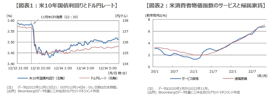 なお、12月12日付レポートで指摘した、サービスと帰属家賃は依然高い伸びが続いていますので(図表2)、米連邦準備制度理事会(FRB)のパウエル議長の見解通り、来年あたりから下がり始めるか否かを見極める必要があります。今回のFOMCでは、基本的にタカ派姿勢が維持されるとみていますが、少なくとも株式市場がインフレを過度に懸念する局面は、終了しつつあるように思われます。