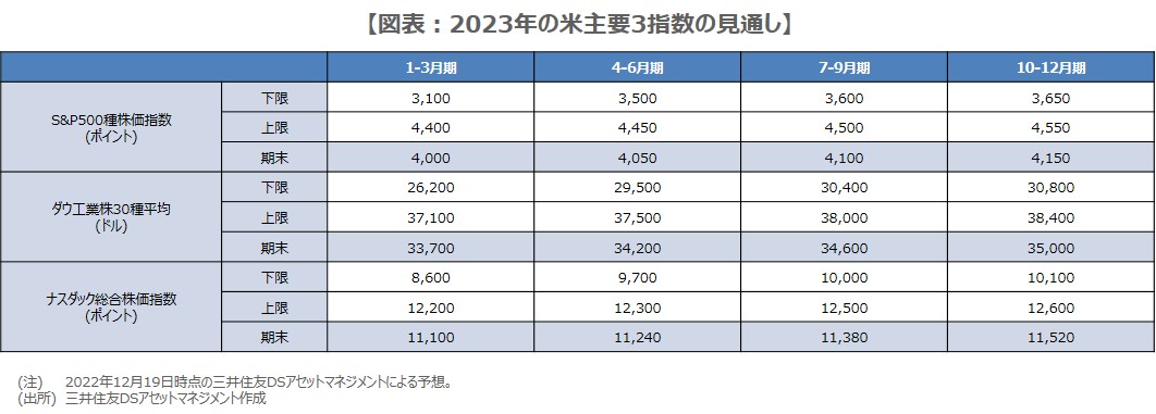また、2023年を通じた米国株の動きとしては、弊社のマクロ経済見通しを踏まえると、1-3月期は米インフレと景気減速の度合いをにらみ「一進一退」、4-6月期は米景気の底打ちで「持ち直し」、7-9月期は夏枯れの季節性もあり、持ち直し一服で「横ばい」、10-12月期は「一段高」が見込まれます。弊社は2024年の1-3月期に米利下げ開始と景気の更なる回復を予想しており、10-12月期はこれを織り込む形での一段高が想定されます。