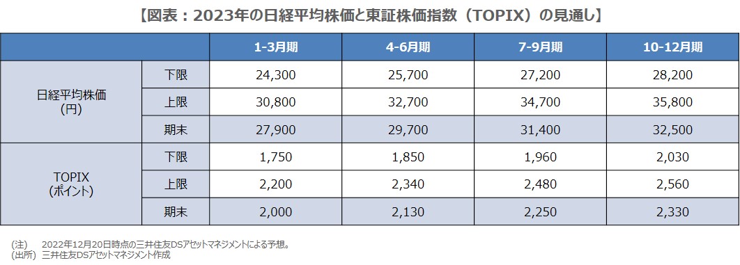 次に、2023年の日本株について、弊社の見通しをご紹介します。基本的な見方としては、日本株は世界経済の成長減速を主因に、しばらくレンジ相場が続くものの、その後は世界経済の持ち直しとともに、相場は回復に向かうというものです。具体的な数値は図表の通りで、2023年12月末の着地水準は、日経平均株価が32,500円、東証株価指数(TOPIX)が2,330ポイントです。