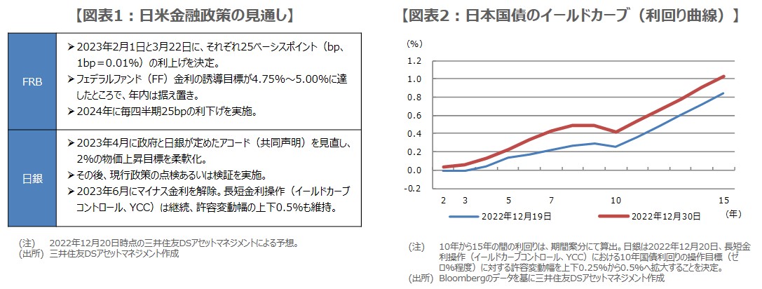 そこで、改めて日米金融政策について、弊社の見方を整理します(図表1)。まず、米連邦準備制度理事会(FRB)は、2023年2月1日と3月22日に、それぞれ25ベーシスポイント(bp、1bp=0.01%)の利上げを決定し、フェデラルファンド(FF)金利の誘導目標が4.75%~5.00%に達したところで、年内は据え置きを予想しています。その後、2024年には毎四半期25bpの利下げを進めるとみています。