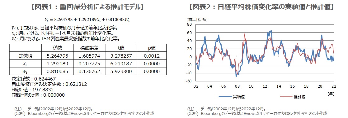 今回のレポートでは、日経平均株価の為替感応度を検証します。具体的には、ドル円レートが1%変化した場合、日経平均株価は何%変化するかについて、重回帰分析という統計手法を用いて推計します。推計期間は2002年12月から2022年12月までとし、日経平均株価、ドル円レートに加え、米サプライマネジメント協会(ISM)が発表している製造業景況感指数を使用します。