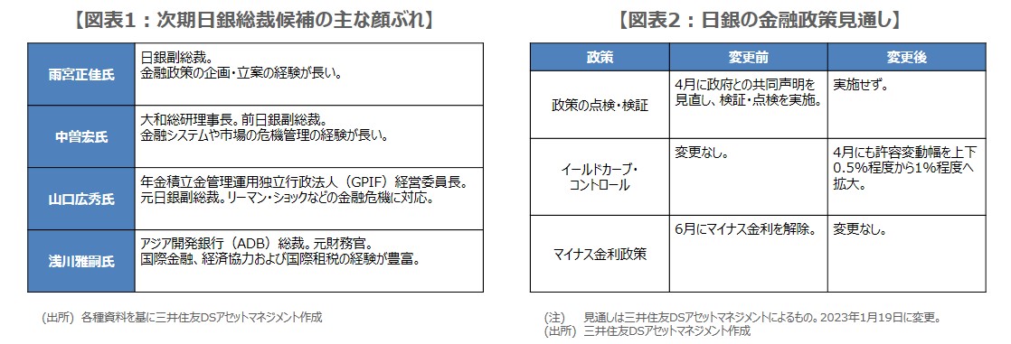 黒田総裁退任後の金融政策を見通す上では、①日銀の正副新総裁の顔ぶれ、②国内の賃金動向、③海外景気が、重要な材料と考えます。①について、総裁候補には雨宮正佳副総裁、中曽宏前副総裁、山口広秀元副総裁らの名前が上っています(図表1)。総裁、副総裁の人選は、アベノミクスに象徴される異次元緩和政策との距離を測る試金石となりますが、岸田首相は自民党最大派閥である安倍派の意向も一定程度、配慮すると思われます。