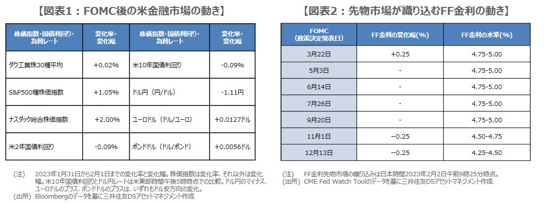 米連邦準備制度理事会(FRB)は、1月31日、2月1日に米連邦公開市場委員会(FOMC)を開催し、フェデラルファンド(FF)金利の誘導目標について、4.25%~4.50%から4.50%~4.75%へ引き上げることを決定しました。利上げ幅は25ベーシスポイント(bp、1bp=0.01%)と、前回12月FOMCでの50bpから縮小しましたが、市場には織り込み済みでした。今回は利上げ停止の手掛かりが焦点でしたので、以下、詳しくみていきます。