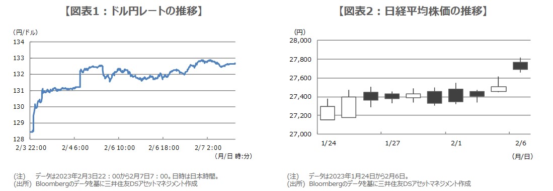 2月6日の市場の動きをみると、ドル円はドル高・円安で反応、日経平均株価は上昇で反応となりました(図表1、図表2)。雨宮氏に日銀総裁就任が打診されたとの報に、異次元緩和の早期修正に対する市場の懸念が和らいだように見受けられます。ドル円については、2月3日の米雇用統計が市場予想を上回る強い内容となったことで、すでに先週末からドル高・円安が進行していましたが、その流れが一段と強まった格好になりました。