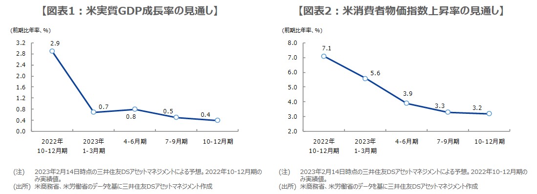 弊社は2月14日に米国の経済見通しを更新しました。米国経済の現状を確認すると、景気は減速方向にあるものの、労働市場の強さが消費を支える格好となり、減速のペースは非常に緩やかなものにとどまっていると推測されます。従来、米国の景気については、2023年の前半には失速感が強まるとみていましたが、1月の雇用統計など直近の経済指標を踏まえ、年末に向けて徐々に失速していくとの見方に変更しました。