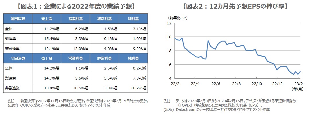 市場の関心はすでに2023年度の業績に移っているとみられますが、3月期決算企業による来年度の業績予想については、4月下旬から本格化する今年度の本決算発表の時期を待つことになります。なお、市場が予想するTOPIXの12カ月先1株あたり利益(EPS)の伸び率は低下傾向が続いています(図表2)。業績見通しに明るさが戻るには、米国の利上げ終了と深刻な景気後退の回避など、外部環境の改善も1つのきっかけになるとみています。